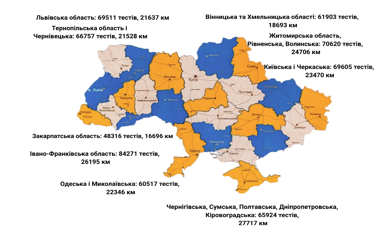 Фахівці УДЦР минулоріч здійснили тестування в 1131 населеному пункті, де було проведено 597 424 тести, при загальній протяжності проїзду мобільних вимірювальних комплексів 202 988 кілометри.