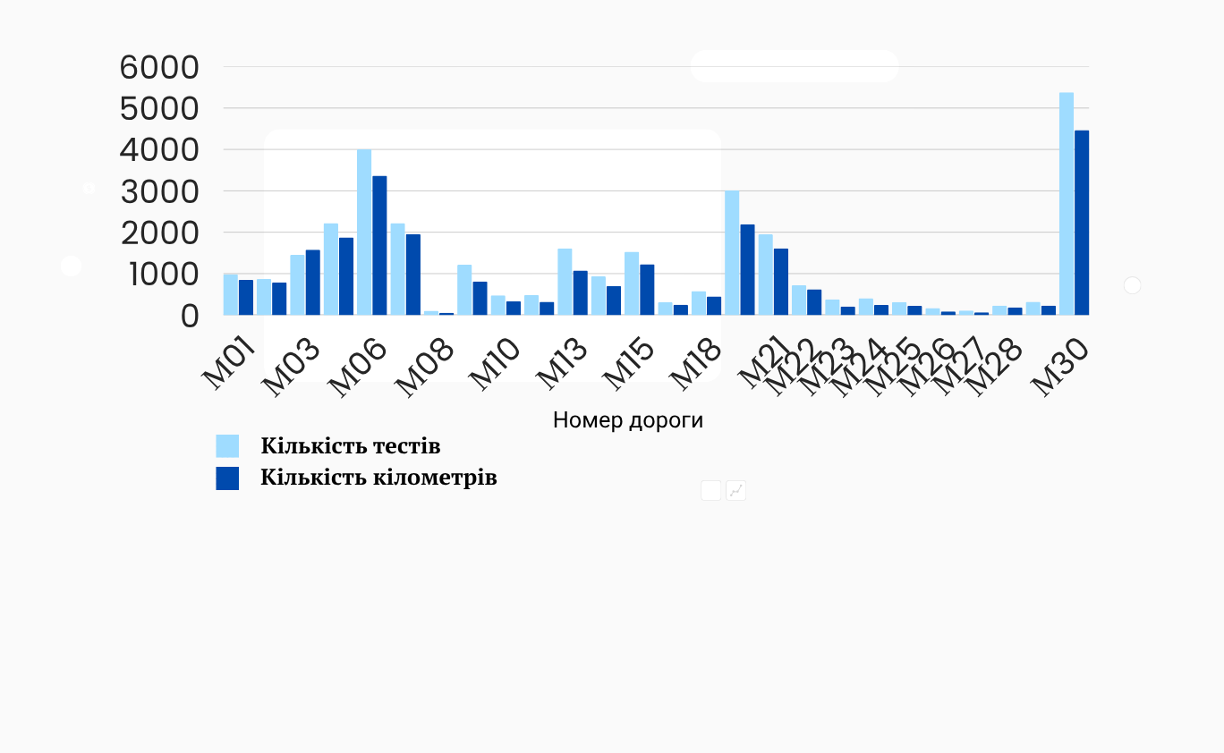 У цей же період здійснено моніторинг якості електронних комунікаційних послуг на ділянках міжнародних автомобільних доріг в межах Закарпатської, Івано-Франківської, Львівської, Тернопільської, Вінницької, Хмельницької, Чернівецької, Житомирської, Одеської, Миколаївської, Київської, Черкаської, Чернігівської, Сумської, Полтавської, Дніпропетровської, Кіровоградської, Рівненської та Волинської областей. Проведено 31927 тестів при загальній протяжності маршруту понад 25730 кілометрів. Найбільш інтенсивне тестування виконано на дорогах М30, М06 та М19.